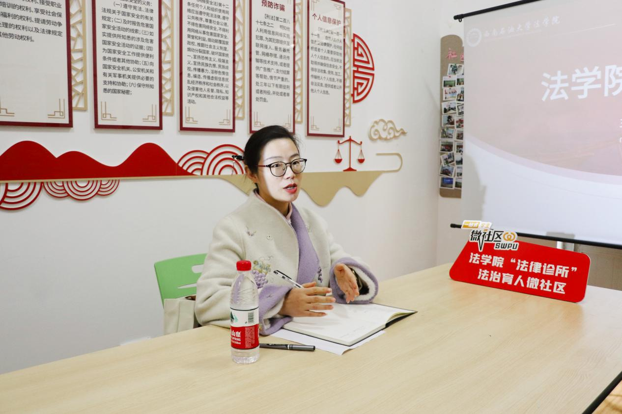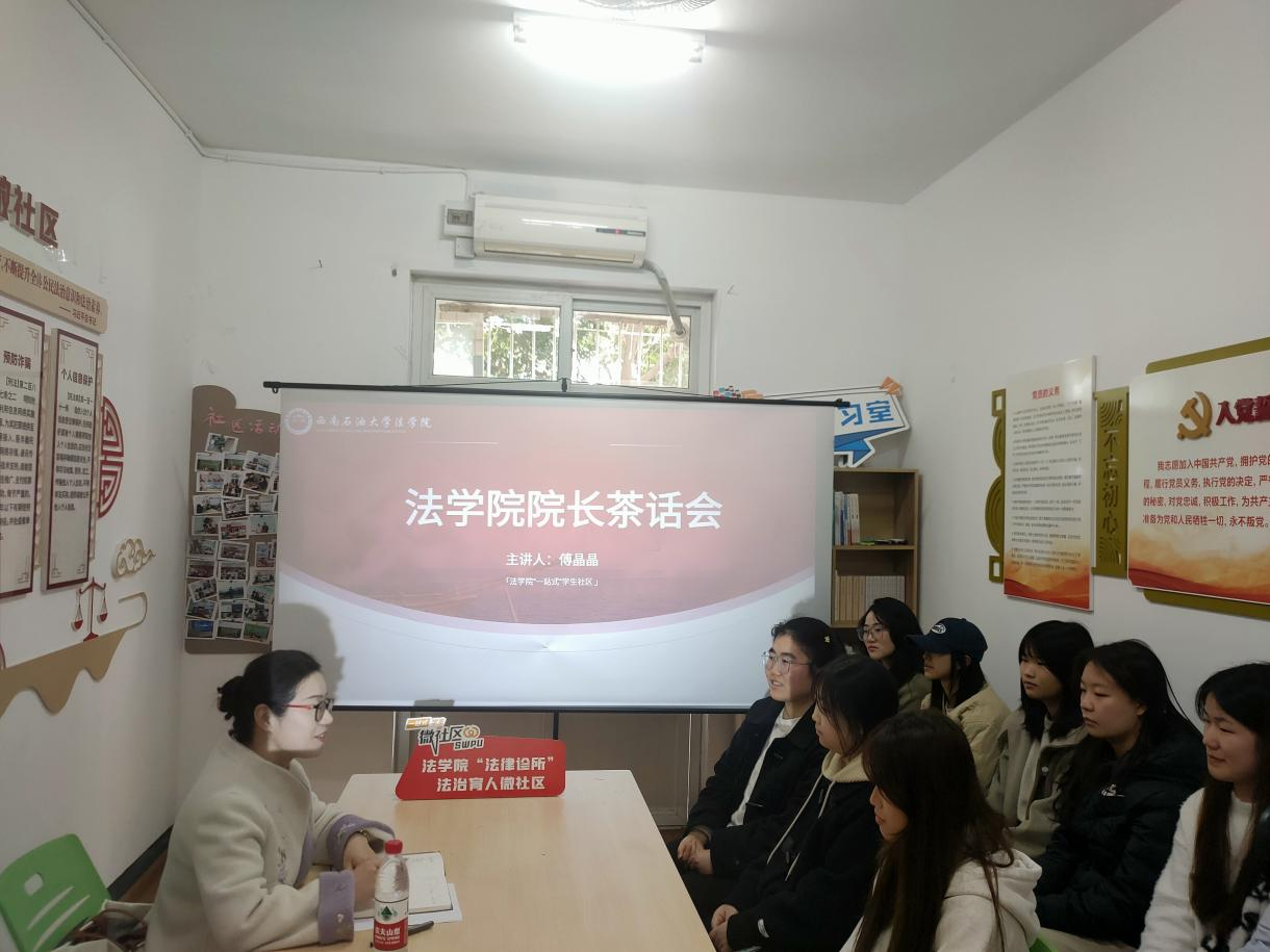 为进一步增进学院师生之间的沟通交流,拉近师生距离,充分了解同学们在学习、生活方面的困惑,走好实事求是路线,法学院于2025年3月13日在弘毅居8栋学生“一站式社区”顺利开展了2024-2025学年春季学期院长茶话会。本次茶话会主持人为法学院辅导员雷婷,与会人员为法学院院长傅晶晶以及法学院2023级各专业学生代表。