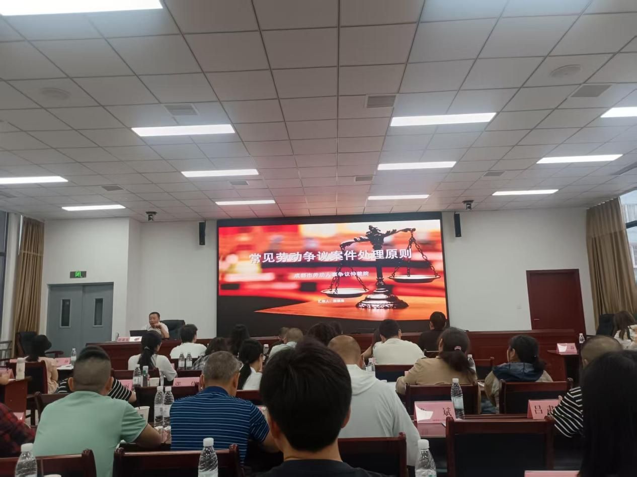 本次讲座邀请了成都市劳动人事争议仲裁院劳动关系庭庭长国富海,围绕《劳动人事争议调节仲裁相关法律法规解读》开展专题培训讲座。国富海以真实司法案例为切入点,还原劳动争议调解全过程,直观展现法律工具在权益维护中的具体应用。