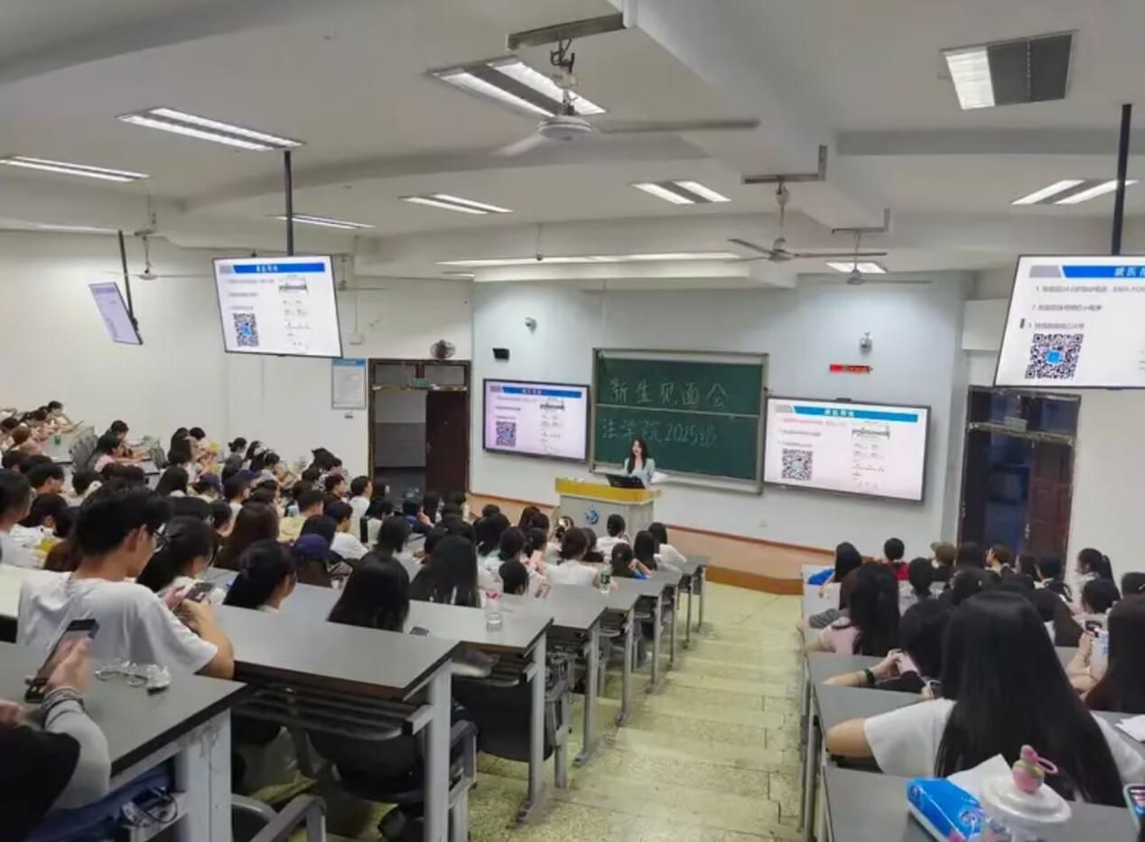 随后,兼职辅导员刘书英老师聚焦“学业航道”,就法学和社会工作专业的学业发展情况进行深入阐述。刘老师详细解读了专业培养方案,让新生们明晰大学四年的学习路径;讲解推免研究生政策,为有深造意向的同学提供明确指引;介绍转专业相关事宜,给予了同学们更多选择的信息参考,助力他们在专业学习上找准方向。