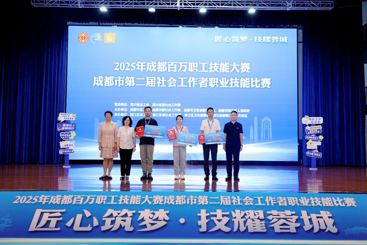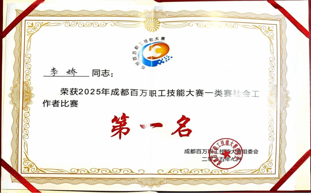 近日,“2025年成都百万职工技能大赛——成都市第二届社会工作者职业技能比赛”在成都市锦江区望江宾馆圆满落幕。本次大赛由四川省总工会、中共四川省委社会工作部指导,成都市总工会、中共成都市委社会工作部、成都市卫生健康委员会、成都市锦江区人民政府联合主办,旨在为社会工作者搭建技能展示与切磋交流的高水平平台。经过与来自全市各级工会、社会工作部门的504名优秀选手的激烈角逐,我院2022届社会工作专业硕士毕业生李娇凭借扎实的理论功底、精湛的实务技能和出色的现场表现,在决赛中力压群雄,以总分第一名的优异成绩斩获大赛一等奖。本届赛事一等奖仅设一名,李娇校友的夺魁,充分展现了我院毕业生的卓越风采与专业实力。