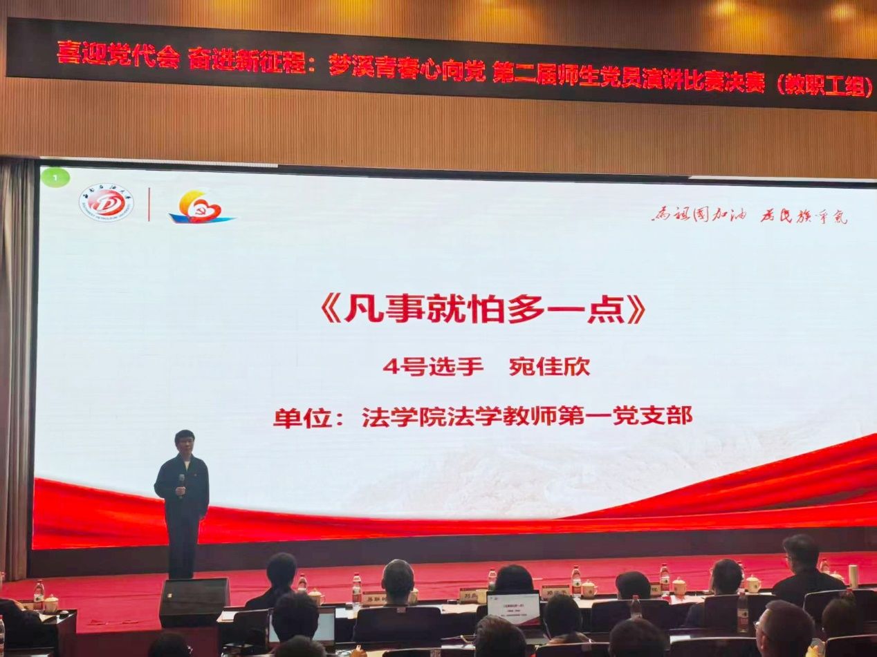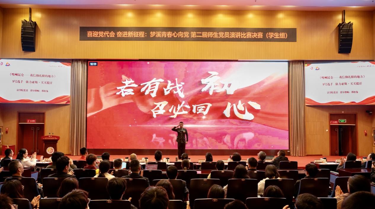 教职工组和学生组分别进行,分别由法学院党委和化工院党委承办,决赛中18位教师和16组学生同台竞技,以铿锵之音抒发家国情怀,以赤子之心诠释党员担当。经过激烈角逐和评委的专业评审,最终我院教师宛佳欣获得教职工组二等奖、法学2022级学生依力亚斯·买买提汗以第一名的得分获学生组特等奖,法学院青年教师李欢担任教职工组决赛主持人,现场表现优异展现出良好素养,法学院党委获优秀组织奖。