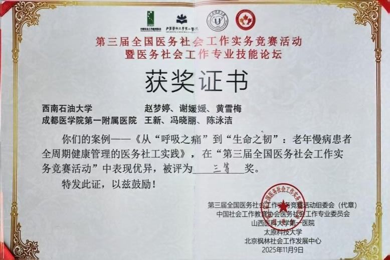 2025年11月7日至9日,第三届全国医务社会工作实务竞赛暨医务社会工作实务论坛在山西太原举行。活动由中国社会工作教育协会、中共山西省委社会工作部共同指导,中国社会工作教育协会医务社会工作专业委员会、山西医科大学第一医院、太原科技大学、北京枫林社会工作发展中心等单位联合主办。全国共有158个项目参赛,经过严格评审,其中61个项目进入全国决赛。由我院2025级社会工作专业研究生赵梦婷、黄雪梅,以及社会学专业研究生谢媛媛共同完成的案例《从“呼吸之痛”到“生命之韧”:老年慢病患者全周期健康管理的医务社工实践》,凭借扎实的实务基础与创新视角,荣获全国三等奖。