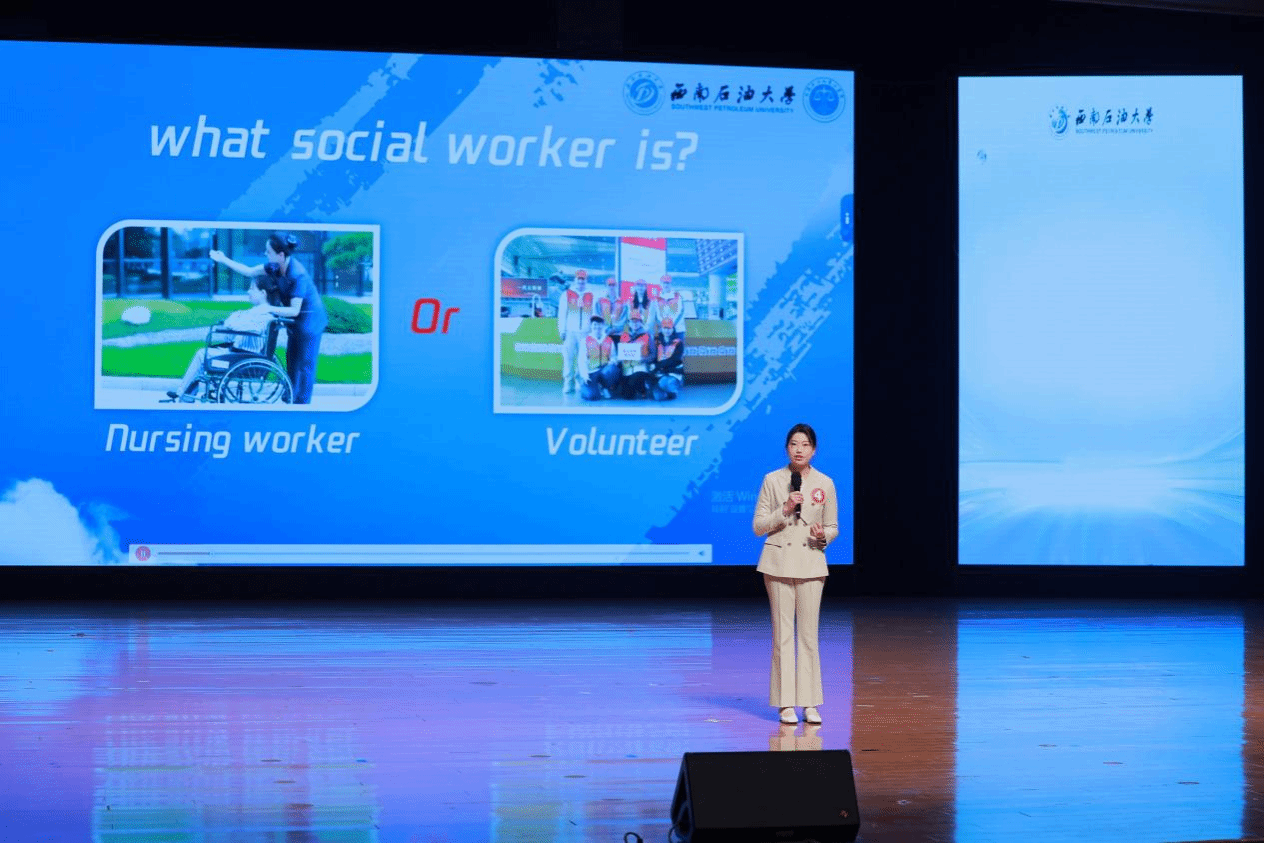 曾丽桦围绕“数智驱动·AI赋能 语通世界·创未来”主题进行了3分钟定题演讲。她以《数智赋能社工,语言链接世界》为题,开篇设问“社会工作是什么”,阐释其“以利他主义为核心、科学方法为基的职业化助人服务”的特征,引发全场共鸣,最终斩获一等奖。