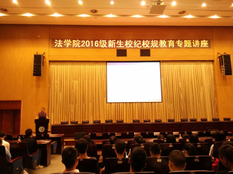 家有家规,校有校记,一个学校的井然有序需要依靠硬性的条文规定。法学院为让新生们能够更快更好适应大学这个全新的自主环境,特邀学院党委副书记王斌老师于9月13日在图书馆报告厅为大家开展了一场校纪校规教育的专题讲座,2016级新生到场参加,为之后的大学生活拉起一条行为准绳。