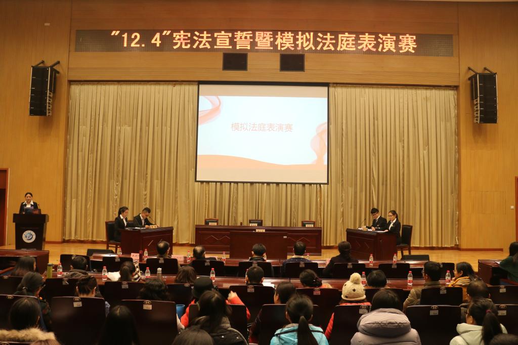 本次活动以“弘扬法治精神、建设法治文化”为主题,以法学院辩论风采展为活动模式,分为宪法宣誓、模拟法庭表演赛及颁奖授徽三个部分。主持人宣布活动开始并宣读安全原则,带领全体人员共同宣誓:“忠于中华人民共和国宪法……为建设富强、民主、文明、和谐的社会主义国家努力奋斗!”现场屏幕上放映着中华人民共和国国徽,气氛庄重而严肃。