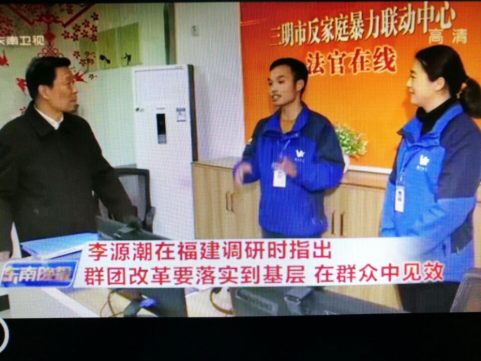 2月24日至26日,中共中央政治局委员、国家副主席李源潮在福建调研群团改革工作。24日下午,李源潮同志一行来到福建省三明市反家庭暴力联动中心调研指导,中心负责人张河亮汇报了中心运营模式和服务成效。在听取完汇报后,李源潮同志与中心工作人员亲切交流,关切询问中心社工人员配置、工资待遇等情况,并指出家庭是社会的细胞,妇联要在家庭建设中发挥独特作用,促进家庭幸福、社会和谐。要提升服务效率,充分发挥社会工作的专业作用,深入群众,扎根社区,主动作为,依法维护家暴受害者合法权益。