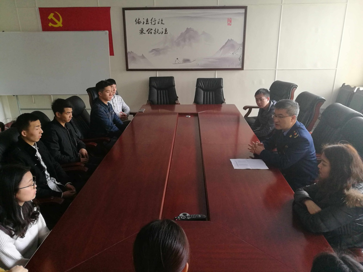 2017年3月20日下午,法学院党委副书记王斌、13级辅导员邓超老师越与13名法学本科应届毕业生,赴新都区新都区市场和质量监督管理局开展实习交流。新都区市场和质量监督管理局综合执法大队曾大队长的亲切接待了我院师生,并就学生过渡性就业合作等事宜进行了交流协商。