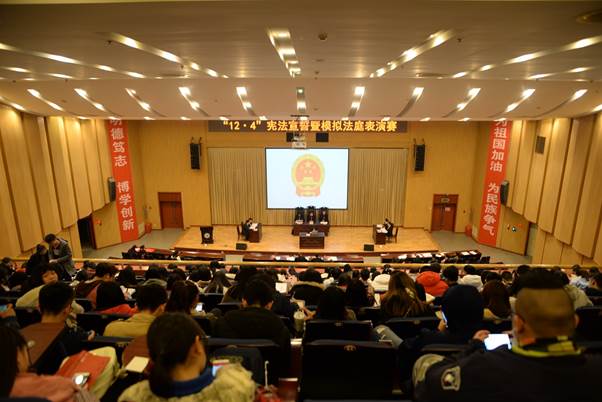 2017年12月4日晚7点,法学院举办“‘12•4’宪法宣誓暨模拟法庭表演赛”并组织2017级、2016级法学专业学生参与。法学院院长卫德佳、法学院党委副书记于百江、法学院副院长王天学、法学院实习实训中心主任洪晓华、法学院团委书记黎子炯以及法学院部分教师出席本次活动。