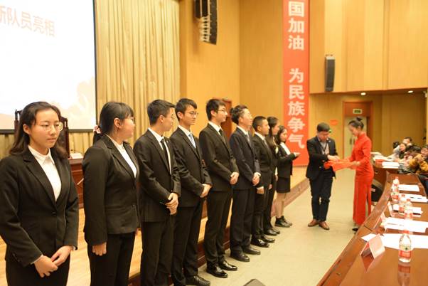 最后,院辩论队新老成员集体亮相,现场嘉宾为 15级队长颁发聘书为17级队员授牌,期待他们为法学院争得更多荣誉。