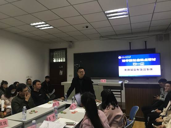 本期研讨会通过专题报告和主题辩论的形式,对“重庆公交坠江事件”进行研讨。主持人就与会报告人、点评人做简单介绍后,研讨会正式开始。在专题报告环节,李静同学、徐逸君同学基于法律层面,就该事件做出了“增加公民破坏公共规则成本的合理性分析”等系列报告;王佳佳同学、何思媛同学以该事件所引发的一系列社会现象为着力点,对网络暴力等现象进行个人观点阐述。练玺同学和杨华同学作为点评人,对上述报告做出了精彩的点评。在主题辩论环节,全体与会同学就如何杜绝“车闹”、公交坠江事件中的责任分配问题进行了热烈的讨论,互相交流观点,进行思想碰撞,现场气氛热烈。