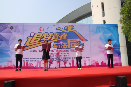 本次活动由成都市新都区全面依法治区委员会办公室、区教育局、区司法局及西南石油大学联合主办。成都市司法局副局长全勇、成都市司法局人调处处长雷彬、区委常委及区委副书记潘捷、区委常委及政法委书记刘刚毅以及成都市新都区委全面依法治区委员会办公室、区人大、区检察院、区法院、区司法局、区委宣传部、区教育局、区团委各部门领导,四川音乐学院、成都医学院、西南石油大学相关领导莅临启动仪式现场。区司法局、新都区电视台相关工作人员以及高校师生代表共同参与,现场气氛热烈,活动开展顺利。