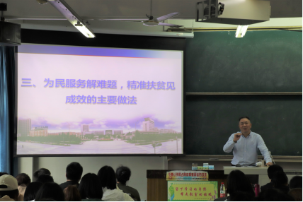 扶贫攻坚道路并不是一番风顺的,张老师从历史讲起,他谈到没有共产党就没有新中国。党提出的“四个全面”中的“全面建成小康社会”,他以自身在大凉山扶贫工作中所遇到的故事,将扶贫工作的思路、方法分享,共同探讨,为同学们以后的工作提供一些前人的经验。