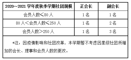 2020~2021学年度秋季学期学生社团招员纳新完成后5个工作日内,校团委将统一公示学生社团负责人名单(具体另行通知)