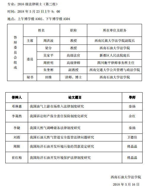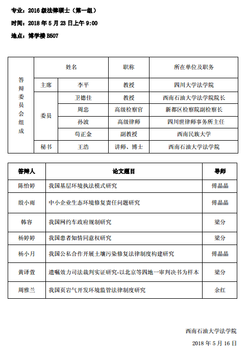 2016级法律硕士毕业论文答辩安排