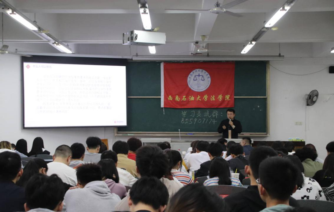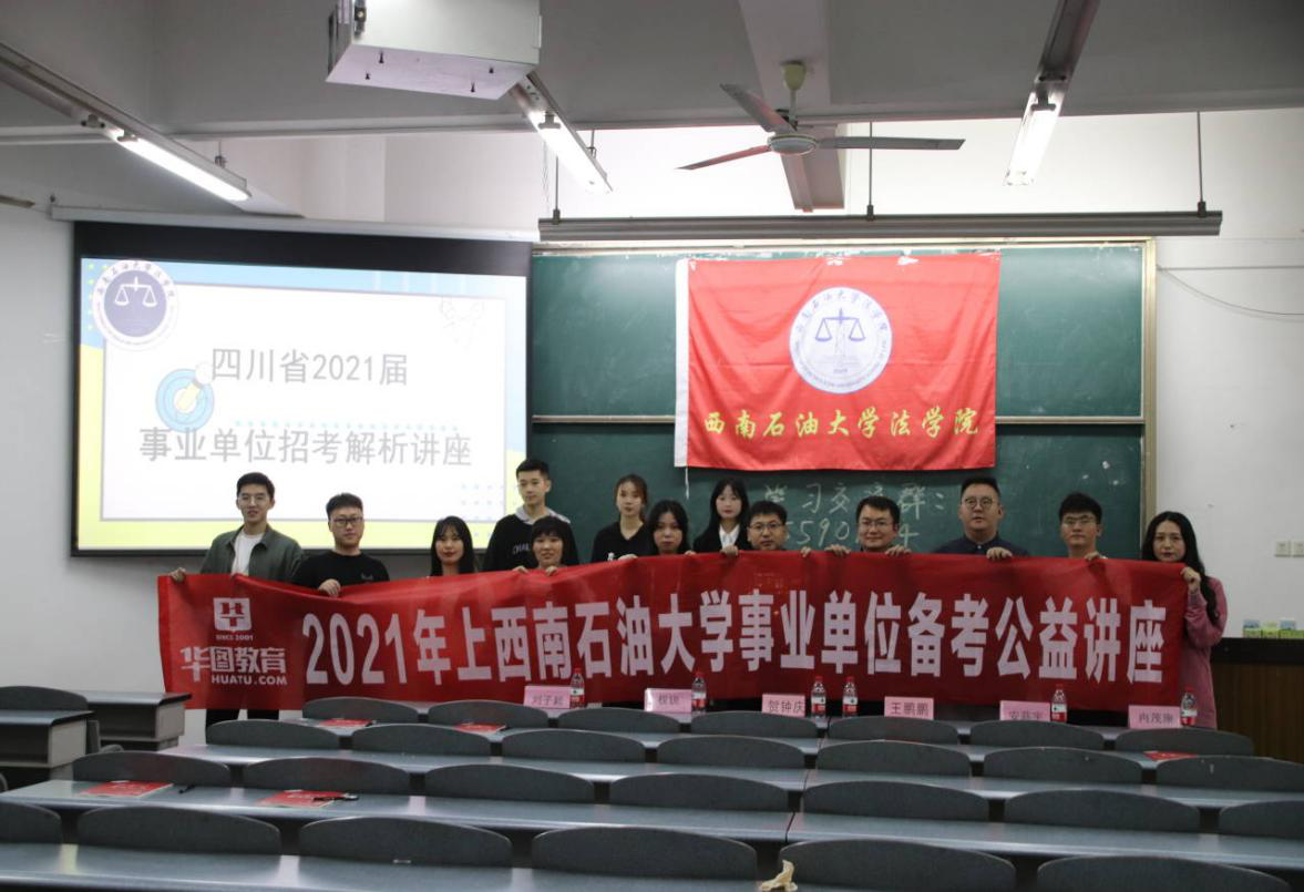 为帮助法学院参与事业单位招考的2021届毕业生了解笔试、面试以及备考的方法和技巧,由西南石油大学招生就业处主办、法学院承办的“四川省2021届事业单位招考解析讲座”于4月21日晚七点在博学楼B502召开。本次讲座邀请到了四川华图教育副校长贺钟庆、华图教育成都学校副校长王鹏鹏与同学们进行分享。