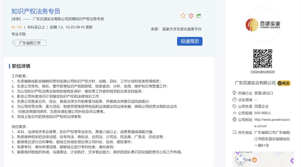 1、本科,法律相关专业背景,知识产权等专业优先,英语六级以上,或者英语阅读能力强;2、熟悉各种相关的法律法规,如专利法、商标法、合同法、公司法、民法典、广告法、劳动法等;3、能够独立进行合同审核,能独立协调处理日常公司纠纷、投诉、侵权事件;4、熟悉专利、商标申请流程,能够独立进行专利检索、商标查询;5、具备良好的组织协调、沟通表达、计划执行、文字表达能力;良好的团队意识及较强的责任心和工作热情。
