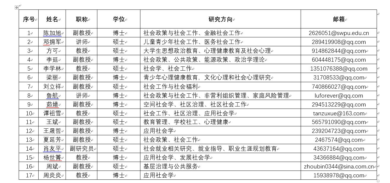 社会工作硕士研究生(校内)导师名单