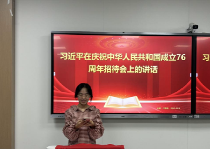 会议伊始,江牧芸同志带领全体支部成员认真学习了讲话原文,系统梳理了新中国成立76年来取得的辉煌成就与宝贵经验。她从“伟大成就彰显制度优势”“法治建设保障复兴伟业”以及“青年一代的使命担当”三个维度进行解读,强调作为法学专业学生,要自觉将专业学习与国家发展需要紧密结合,为法治中国建设贡献智慧力量。