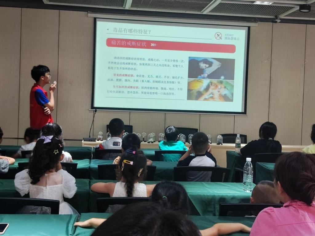 活动伊始,护航青春实践团的成员们以严肃而又不失生动的语言,向小朋友们详细讲解了毒品的种类、危害以及防范知识。同时引用《中华人民共和国禁毒法》《中华人民共和国刑法》等有关毒品管制的法律规范和一个个真实的案例,让孩子们深刻认识到毒品对个人、家庭乃至社会的巨大破坏力。随后,现场播放了一段精心选取的有关禁毒历史和危害的小视频,以直观的画面和震撼的音效,进一步加深了孩子们对毒品危害的印象。