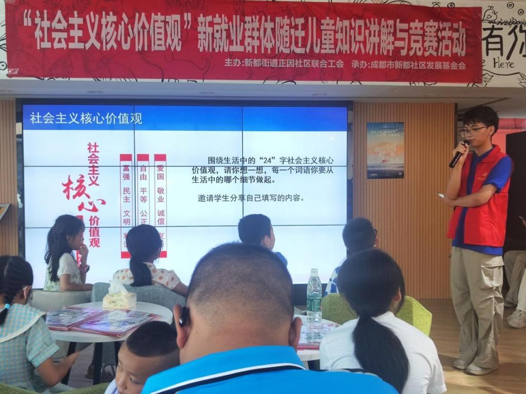 为带领新就业群体随迁儿童学习社会主义核心价值观,扣好人生第一颗扣子。7月11日上午,西南石油大学法律协会“护航青春”实践团在新都区蓉客e家会议厅内精心策划与组织了以“社会主义核心价值观的力量”为主题的知识宣讲与竞赛活动,通过艺术学习和竞赛活动的形式让儿童深刻理解并践行社会主义核心价值观。
