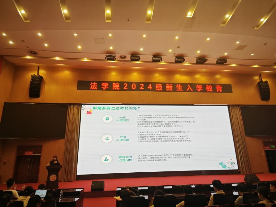 为帮助2024级同学们更好地调整心态,适应新环境,开启精彩的大学生活,法学院于9月12日在图书馆报告厅处开展了新生入学心理健康教育活动。