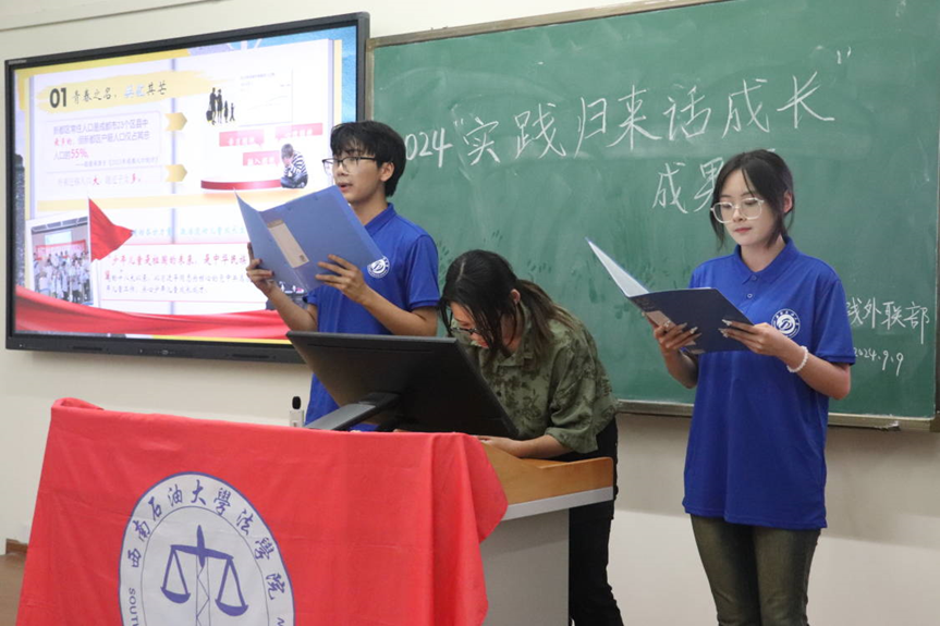 青春正扬帆,启航往无前。为深化大学生社会实践教育,促其增长才干、贡献社会,同时为青年学子树立正确三观,激发创新精神与实践能力,西南石油大学法学院团委实践外联部“实践归来话成长”暑期社会实践成果展示活动于9月9日19:00在明辨楼C205成功举办。本次活动邀请了法学院团委书记兼2021级辅导员邓超越、2022级辅导员邵梧枭、2023级辅导员雷婷以及2024级辅导员肖丹老师担任评委。