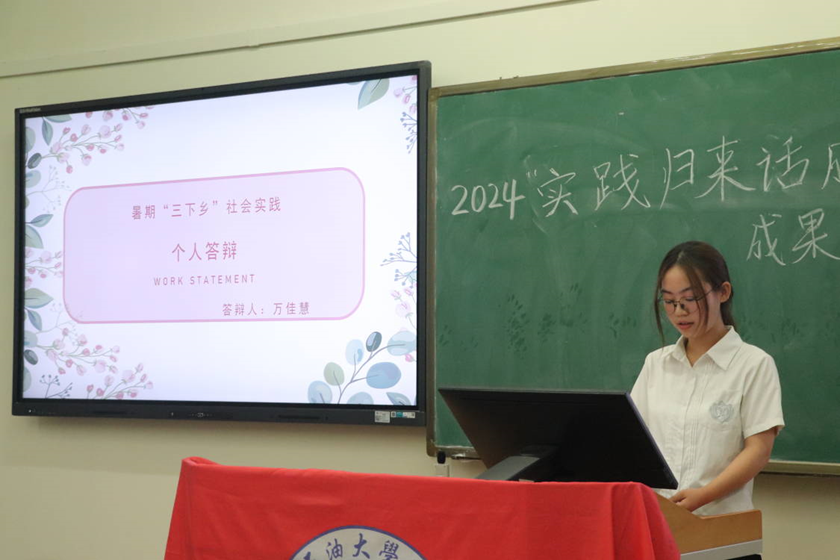 活动精心策划,为各实践队充分提供展示的舞台。活动分为优秀实践团队风采答辩与优秀个人心得交流两大环节。团队代表们生动讲述实践故事:有的团队深入革命老区,探索现代农业发展模式,深刻领悟党的精神对乡村振兴的精神引领作用;有的团队通过实地调研、深度访谈,感受中华优秀传统文化中蕴含的深远意义;还有的团队秉持法治引领的理念,以寓教于乐的方式,让青少年在欢乐中学习法律知识,激发爱国情怀。随后,优秀个人分享了他们的亲身经历,有的担任队长,运筹帷幄,确保实践活动顺利进行;有的负责宣传,多篇新闻稿被各大官方网站采纳,积极传播青春正能量。答辩结束后,评委老师邓超越进行了总结点评。老师对参与本次答辩活动的同学从PPT制作、内容展示、时长控制等方面提出建议;同时鼓励2024级的同学们珍视社会实践机会,从本次活动成果展中汲取经验,将理论知识与实践紧密结合,展现出新时代大学生的蓬勃朝气。