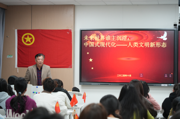 为切实发挥关工委和“五老”作用,坚持不懈用习近平新时代中国特色社会主义思想铸魂育人,实施新时代立德树人工程。2024年11月7日,法学院在博学楼B101举行“青马工程”骨干班第六期开班仪式暨理论教育讲座第一讲。学校关心下一代工作委员会德育指导组成员、马克思主义学院退休教授杨博文受邀为法学院“青马工程骨干班”学员做主题为《中国式现代化——人类文明新形态》的分享。
