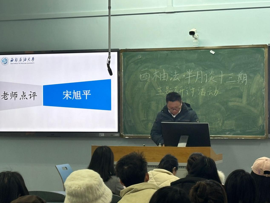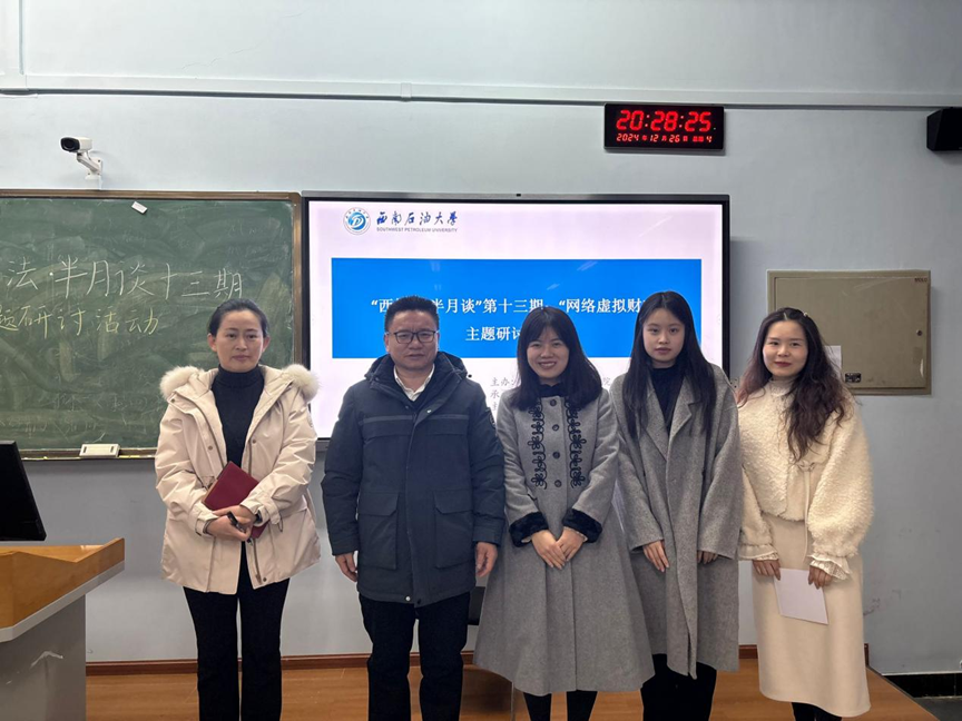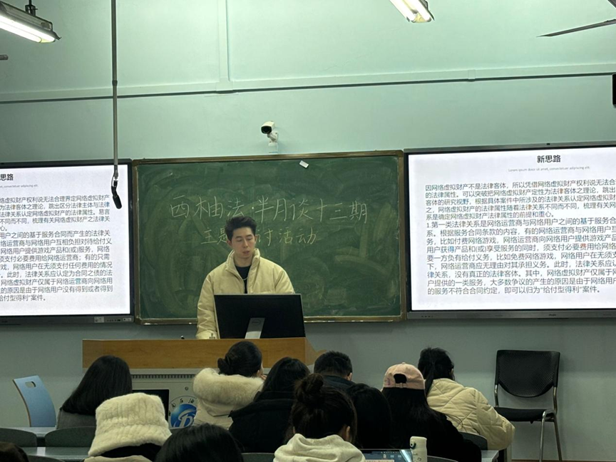 随着互联网技术的迅猛发展,网络虚拟财产已成为现代生活中不可或缺的一部分。2024年12月26日晚,由西南石油大学法学院主办、西南石油大学法学院研究生分会承办的主题为“网络虚拟财产”的第十三期“西柚法·半月谈”于博学楼A502教室顺利举行。六位同学作为汇报人以“网络虚拟财产”为主题展开研讨汇报,并且邀请了陈恋、吴晓敏、宋旭平三位老师作为嘉宾与在场同学进行交流。