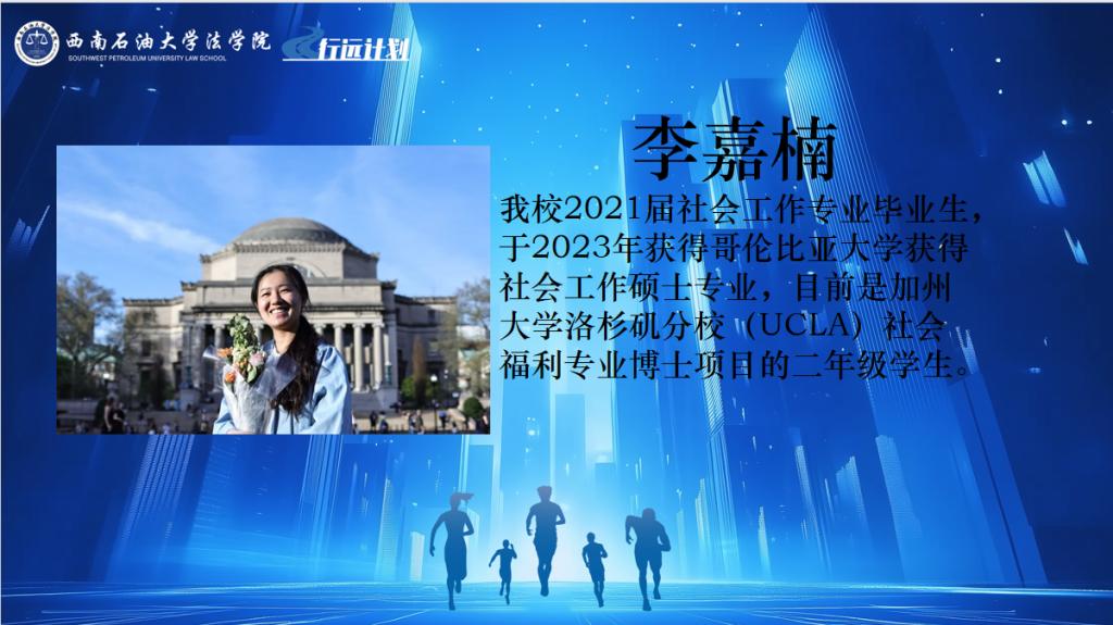 5月12日,法学院“行远计划”品牌活动之“早鸟行动”系列讲座社会工作专业留学经验分享会于腾讯会议云端启幕。本次活动特邀优秀校友李嘉楠担任主讲嘉宾,为低年级学子解码留学规划之道,旨在以榜样力量点燃学术理想,以实践经验铺就国际化成长路径。