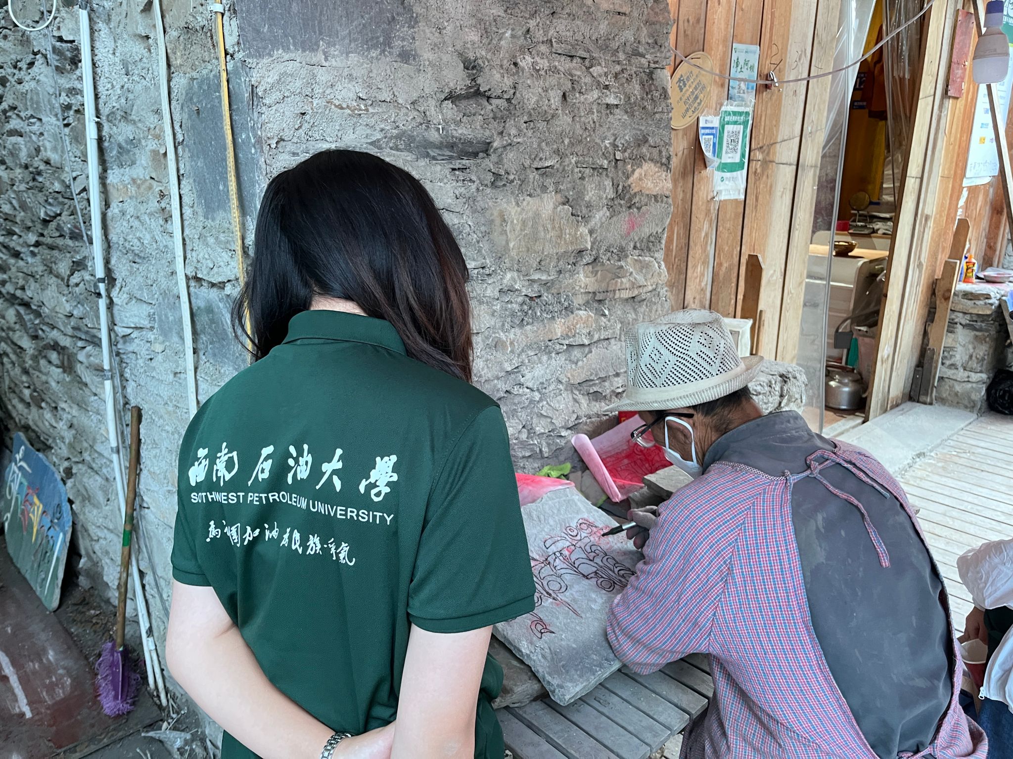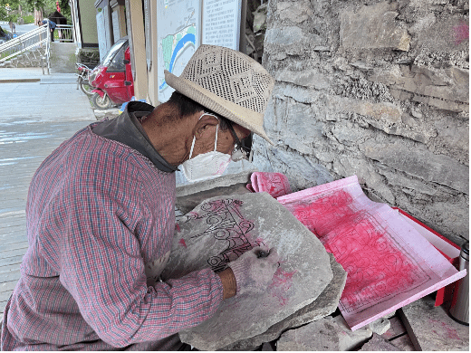 在访谈期间,老书记一边与队员交流一边在石板上刻文。这是传统的藏传佛教玛尼石刻技术,在石上刻下经文并打磨、上色两遍,不仅体现了藏文化的丰富底蕴,也传递着老书记对乡村向上向好发展的美好祈愿。
