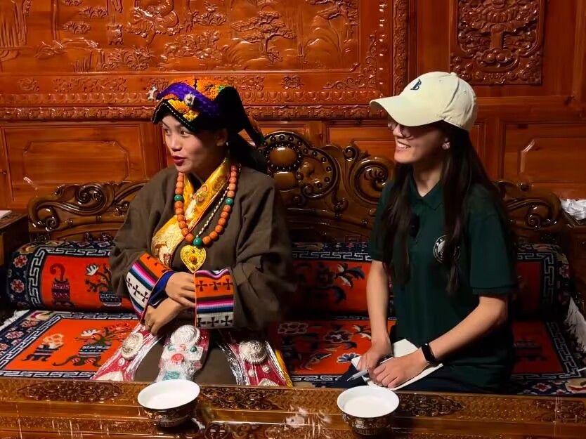 面对实践队的采访,民宿姐姐讲述了一段动人的家族故事:她的叔叔是一位喇嘛,曾闭关修行三年三个月零三天,唯一陪伴他的便是一幅描绘历代法王的唐卡。这幅唐卡既是信仰象征,也成为他精神的寄托,至今仍承载着家族深厚的情感。她介绍,唐卡大小不一,最大可达两米,绘制耗时长,工艺复杂,是嘉绒藏族艺术与宗教融合的典范。为了更直观地展示民族服饰文化,民宿姐姐还特地穿上了藏族传统服饰,展示出嫁时的典礼穿戴,并向队员们介绍:每位藏族女孩出嫁前都要准备嫁妆,衣物饰品十分贵重,穿戴过程庄重而繁复,体现了对婚礼与家庭的重视。