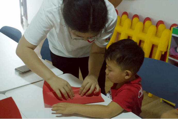 随后,在政能量语桥振兴实践队成员张芷涵的耐心指导下,孩子们亲手参与制作五星红旗。张芷涵一遍用普通话讲解国旗的制作步骤和象征意义,一边示范裁剪和粘贴技巧。孩子们认真听讲,小心翼翼地将五角星粘贴在红色旗面上,每一个动作都充满庄严与专注。制作完成后,他们高举自己完成的作品,用普通话响亮地说出“我爱祖国”“我是中国娃”,纯真的话语中洋溢着浓浓的自豪感和归属感。