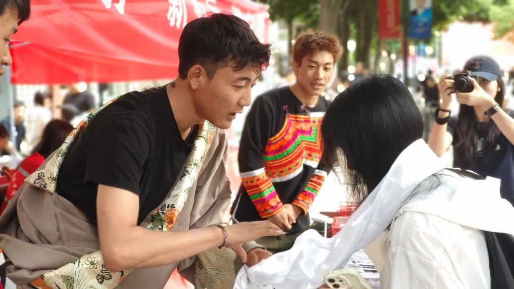 真情祝福,民族团结凝聚育人初心。活动尾声,中华民族文化协会成员身着传统服饰,以热情歌舞展现多元文化魅力,并向新生献上象征纯洁与祝福的哈达。悠扬的歌声传递团结友爱、包容共融的校园文化,诚挚的礼节表达了对新同学的欢迎与祝愿。“没想到一下楼就遇到这么精彩的活动,一下子就能感受到学院的温暖和活力!”法学院张同学感动地说。整场活动不仅是一场迎新快闪,更是一次深刻的入学教育,筑牢了民族团结和社区认同的思想根基。