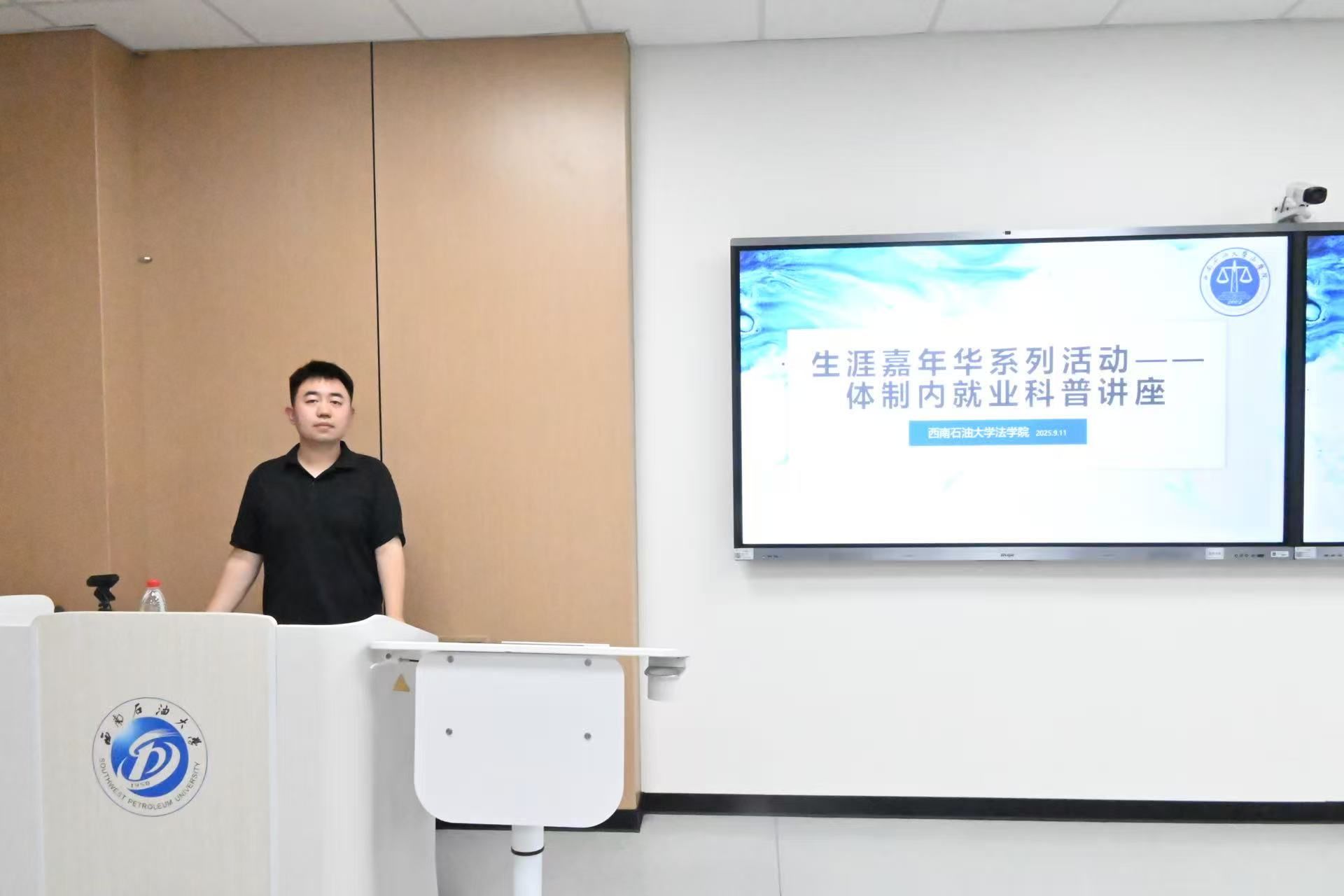 为帮助有意报考公务员的同学更全面地了解体制内就业并做好相应准备,西南石油大学法学院于2025年9月11日(星期四)下午,在博学楼A102教室成功举办了“生涯嘉年华”系列讲座——面向26、27届学生的体制内就业科普专题讲座。活动同时通过飞书会议平台进行线上直播,特邀高顿教育CDC职业发展中心资深特聘讲师朱超担任主讲嘉宾。