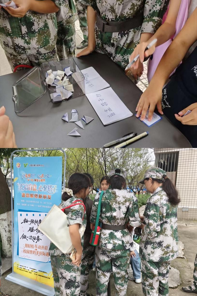 活动现场,醒目的展架标语“抽一张纸条,碰一份缘分”吸引众多身着迷彩服的新生驻足。 有的同学抽到“寻找一位同色系穿搭的同学合影”任务,便在校园里欢快寻觅;有的同学抽到“和陌生人分享一件开学以来的趣事”,新生们也鼓足勇气与身边同学交流。任务设计兼具趣味性与社交性,现场笑声不断,新生们从腼腆试探到主动协作,人际距离悄然消弭。