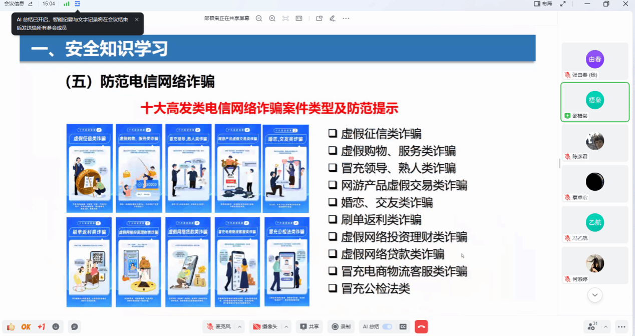 班会围绕“安全防范”“法纪教育”“文明礼仪”三大模块展开系统讲解。在安全防范环节,邵梧枭老师结合近期真实案例,重点强调了国家安全的重要性,提醒同学们要增强防范意识,自觉抵制境外渗透与不良信息,并熟知12339举报渠道。针对校园生活安全,他详细讲解了宿舍与实验室防火要点,明确指出禁止使用大功率电器、私拉电线,并要做到“人走断电”;在防范电信诈骗方面,他重申“三不一多”原则,引导学生“不轻信、不透露、不转账、多核实”,切实守护财产安全。此外,邵老师还就交通出行安全、防震应急知识作了系统说明。