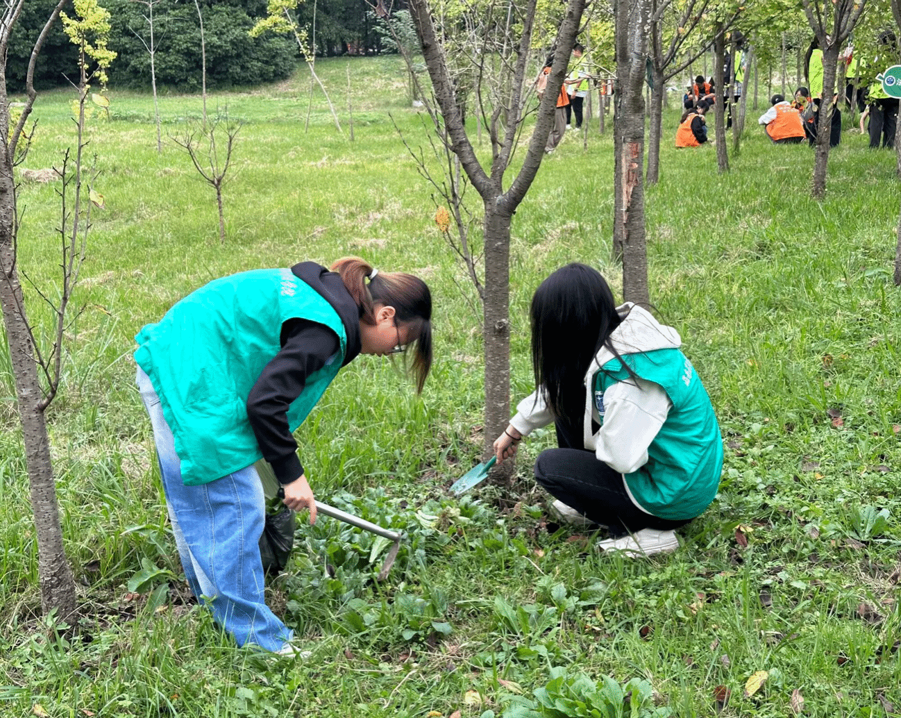 “小法柚”志愿者认真地用铲子除草