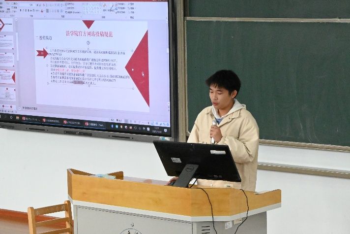 会议伊始,法学院团委副书记(学生)彭丽颖讲话。她在发言中强调了学生骨干的作用,希望各部门同学作为学生干部,要牢记使命、锤炼本领、兼顾学业,努力成为全面发展的表率。