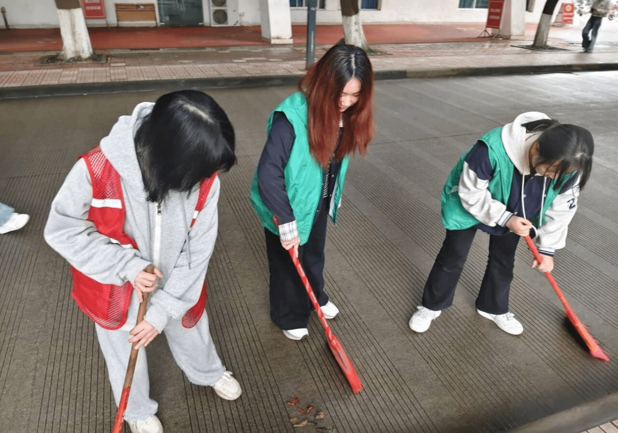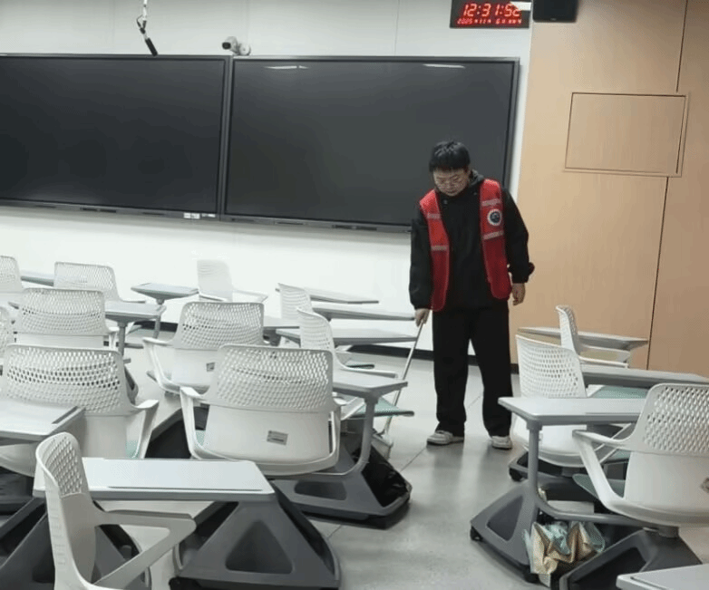 志愿者们在负责人的统筹安排下分组行动,迅速投入清扫工作。在教学楼教室内,志愿者们手持清扫工具,细致清理地面垃圾、擦拭桌椅板凳与黑板,不放过角落缝隙的灰尘,全力还原教室整洁面貌,为师生打造干净的教学与学习空间;在银杏苑区域,针对落叶堆积问题,志愿者们分工协作,有的用扫帚清扫落叶,有的将垃圾分类装入垃圾袋,有序清理绿化带及步道杂物,让银杏苑重拾清爽整洁。