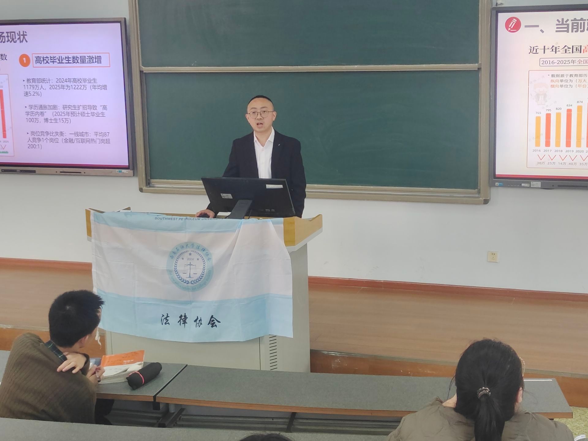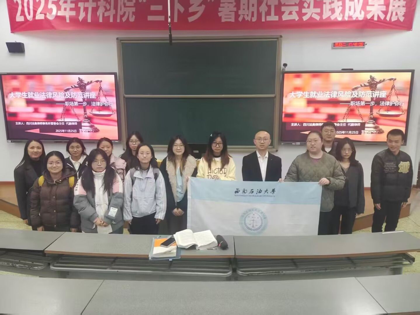 为了让在校学生和应届毕业生掌握劳动法律法规,增强在就业过程中的自我保护能力,西南石油大学法律协会于2025年11月25日采用线上与线下同步的方式,举办了一场以劳动者权益保护为主题的讲座。此次活动特别邀请了学院2012届校友、资深律师代鹏作为主讲嘉宾。