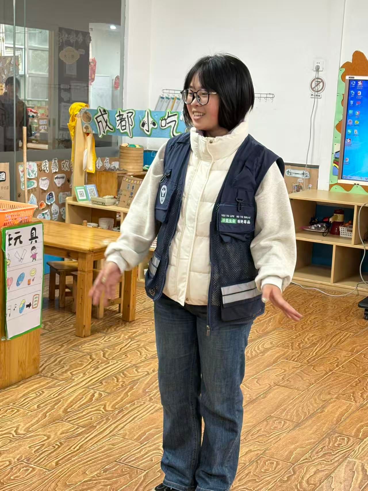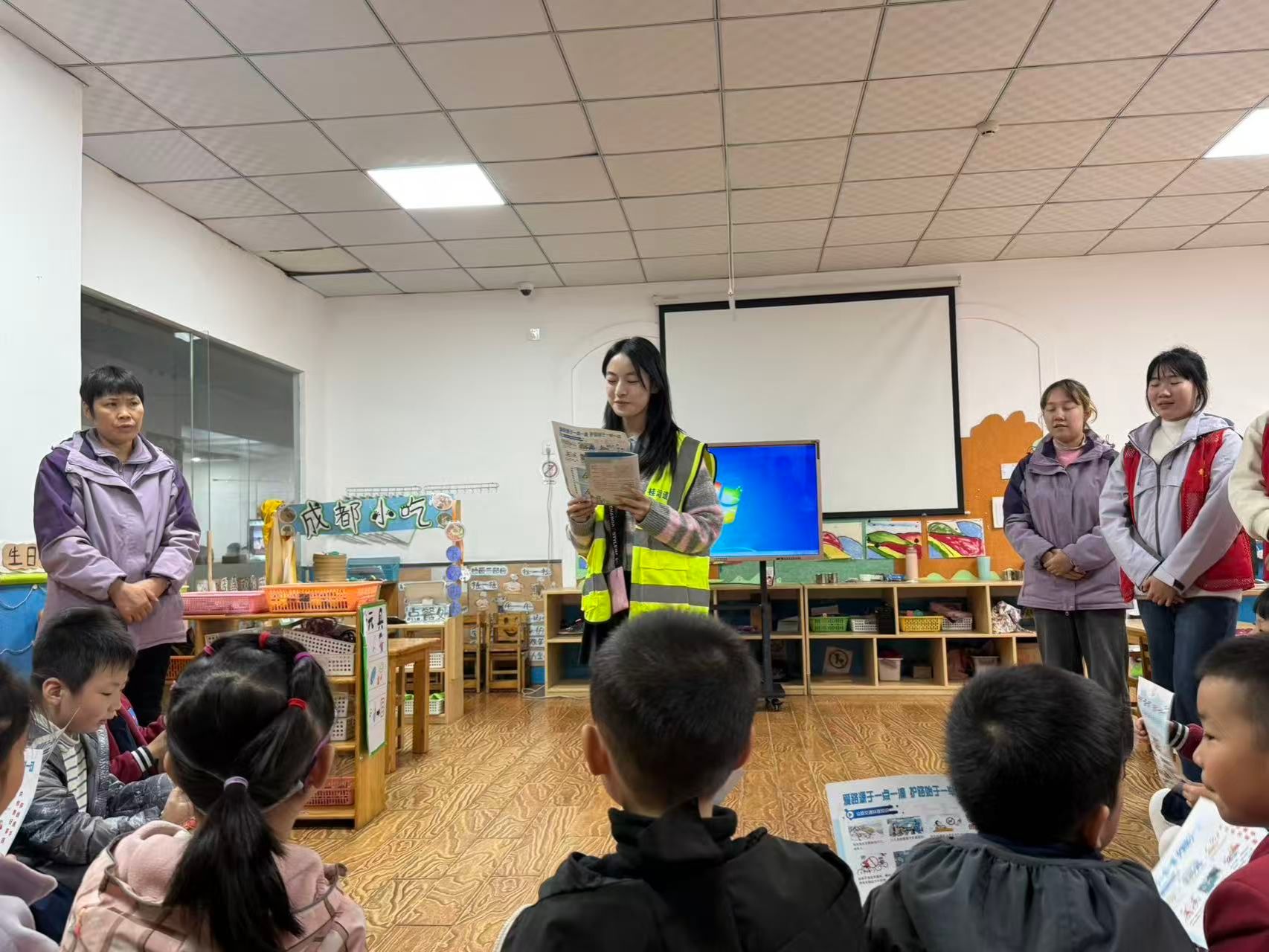 活动伊始,团员志愿者们结合幼儿的认知特点,将防拐骗、防磕碰、交通安全等核心安全知识,改编成了朗朗上口的儿歌和简单易懂的情景剧。在“防拐骗小测试”环节,志愿者扮演“陌生叔叔”“阿姨”,拿着玩具和零食尝试“带走”小朋友,大部分孩子能牢记志愿者此前传授的“不轻易跟陌生人走、及时向老师求助”等技巧,成功识破“骗局”。