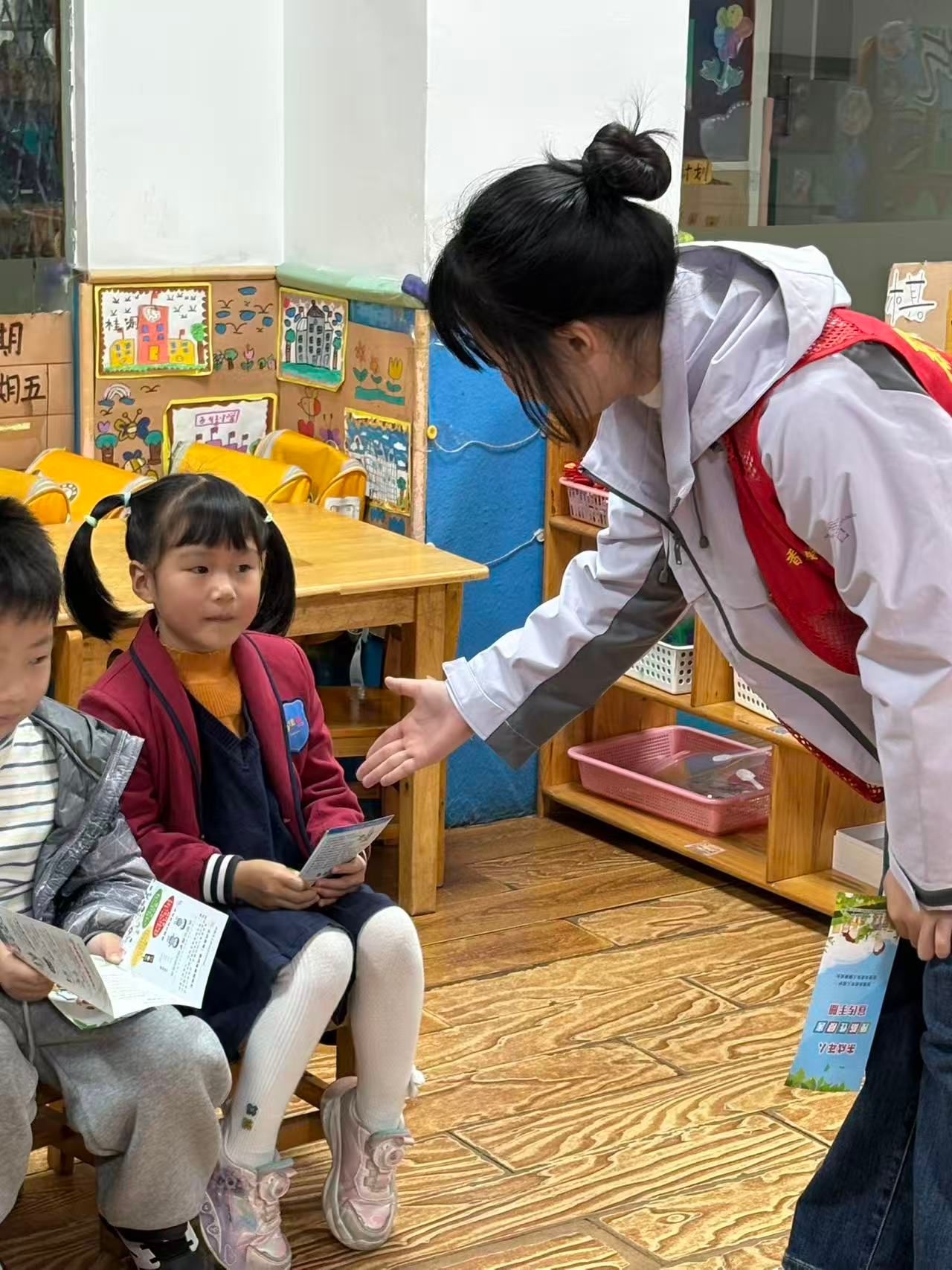 志愿者为小朋友普及安全知识 志愿者与小朋友互动