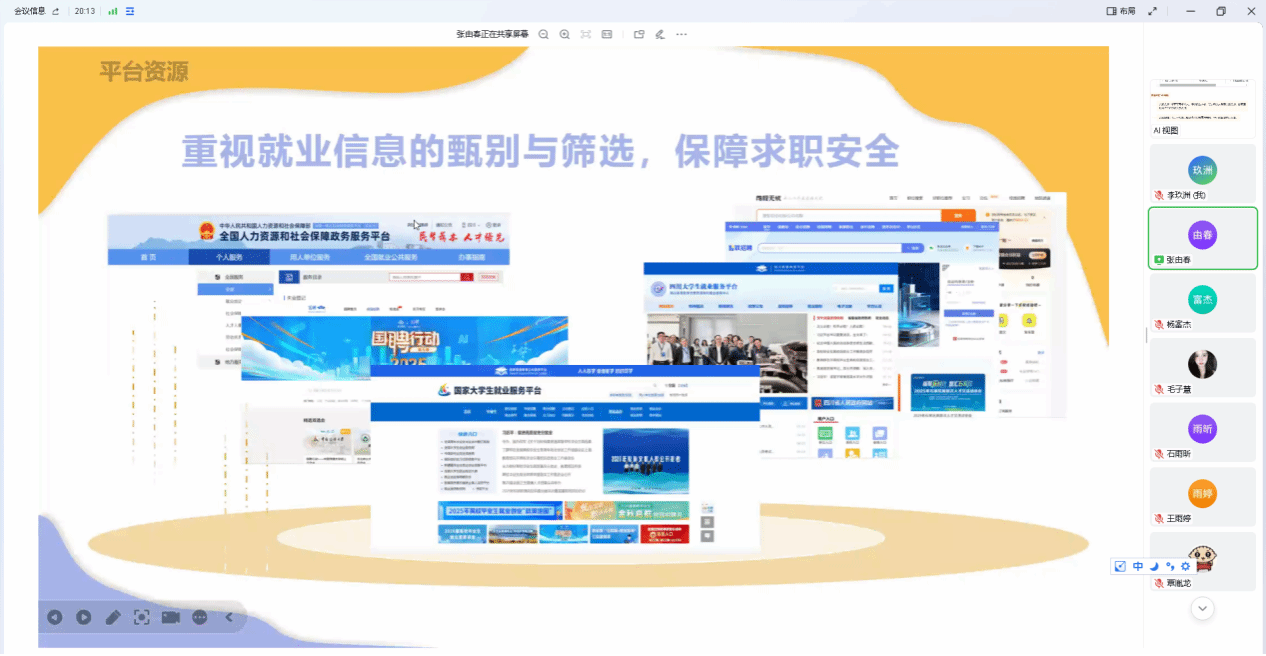 资源整合是本次班会的核心亮点。张由春老师强调,求职过程中既要牢牢把握学校就业中心、校友网络、家庭支持等“强关系”资源,主动寻求精准帮扶;也要充分挖掘社交平台、行业社群等“弱关系”带来的信息红利,拓宽就业信息获取渠道。为帮助同学们安全高效利用资源,她还特别提醒大家重视就业信息的甄别与筛选,推荐了全国人力资源和社会保障政务服务平台、国家大学生就业服务平台等官方渠道,为同学们的求职之路筑牢安全防线。