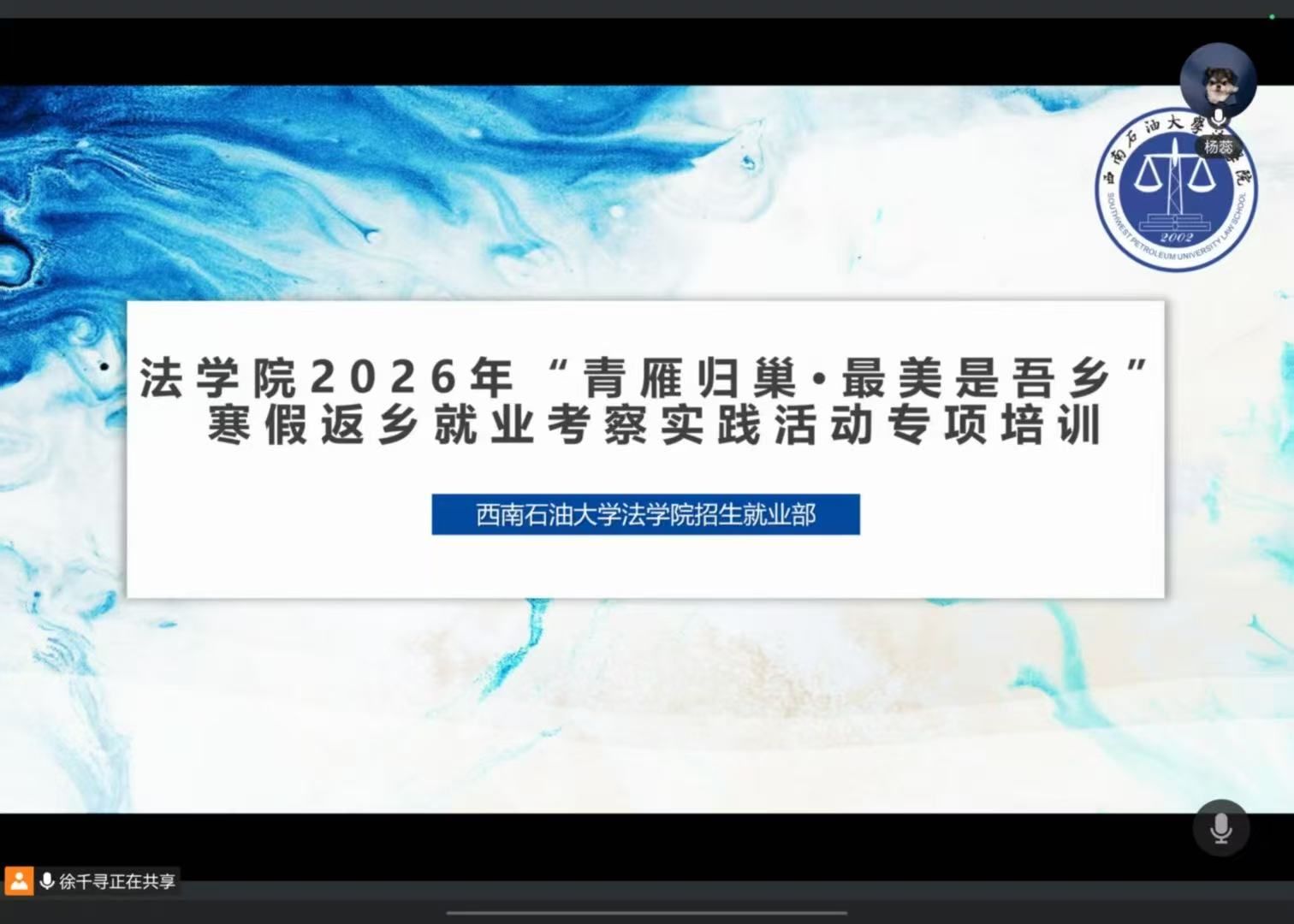 为打破地域限制、鼓励学子返乡实践,西南石油大学“青雁归巢”返乡实践线上培训会于12月24日通过腾讯会议平台顺利召开。本次培训由招生就业部部长徐千寻担任主讲人。法学院百余名学子云端相聚,共同为寒假返乡实践蓄力。