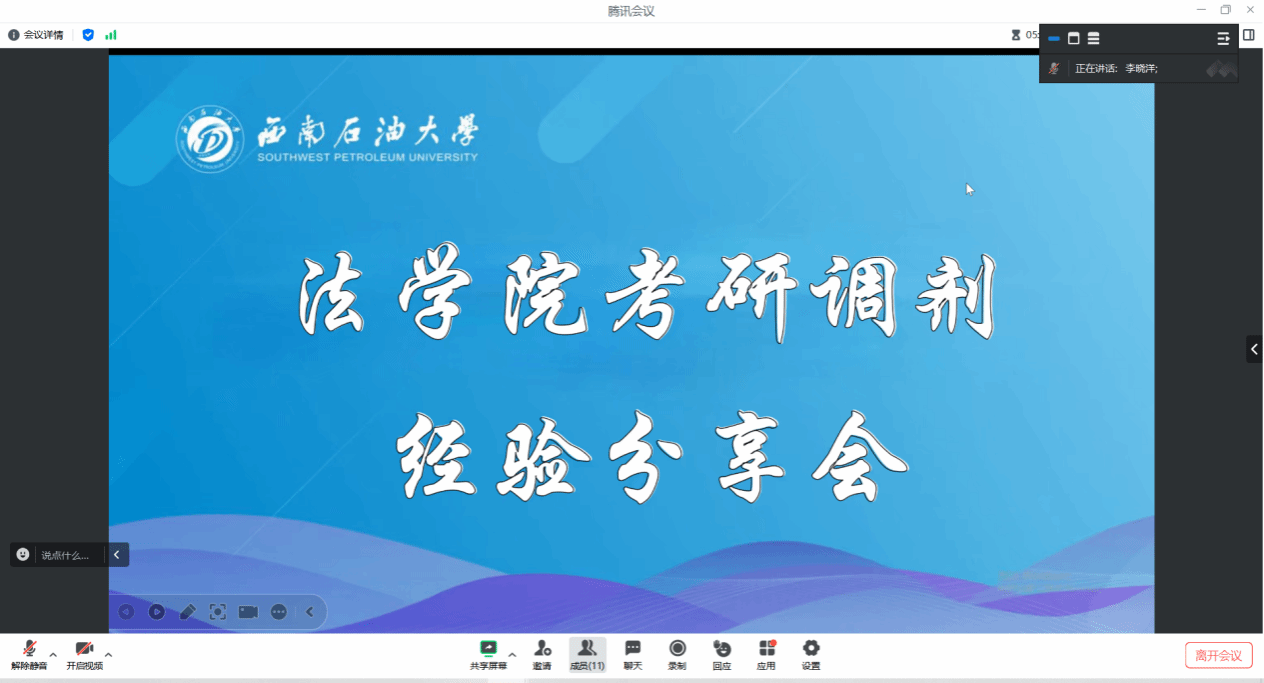 为帮助我院2022级学子清晰把握2026年考研调剂关键流程,有效缓解备考焦虑,切实提升调剂上岸竞争力。4月2日晚,学院通过线上腾讯会议形式,顺利举办2026届毕业生考研调剂经验分享会。本次活动特邀调剂至昆明理工大学的2025届法学专业毕业生臧小钰师姐担任主讲嘉宾,为有调剂需求的同学倾囊分享实战经验。