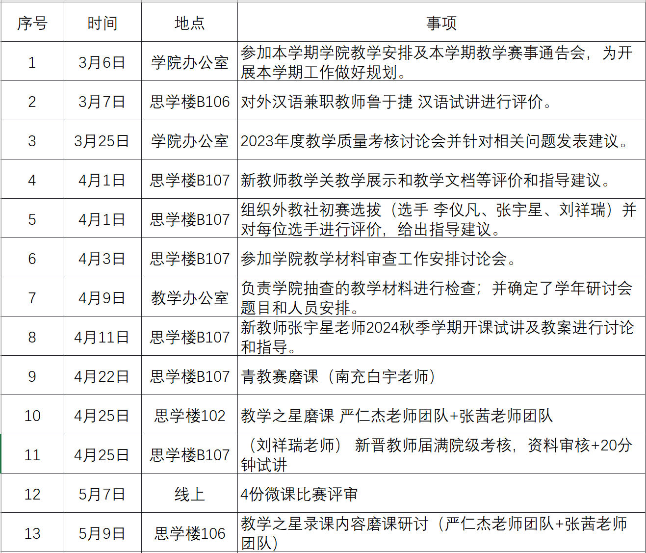 学院教学督导委是学院本科教学建设的智囊团,始终遵循严格监督、合理指导、准确评价和真诚帮助的原则,组织开展督教、督学、督管,为学院本科教学质量的提升发挥了积极作用。本学期根据学院本科教学工作整体安排,学院教学督导委已完成了新进教师教学文档和教学展示的评价及指导、学院教学文档抽查、教师教学比赛选拔及磨课等工作,具体详见下表。