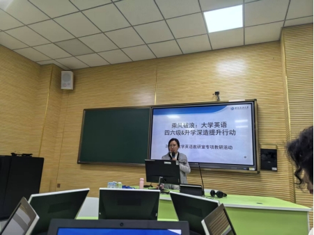 2025年2月27日下午,外国语学院大学英语第一和第二教研室在思学楼B107联合举办了"乘风破浪·大学英语四六级&升学深造提升行动"专项教研活动。本次活动由外国语学院副院长陈婧主讲,围绕学院"5+5"提升计划的实施开展深入研讨。