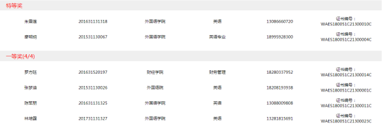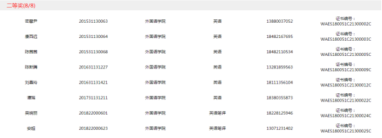 本届挑战赛由写作,演讲,阅读三大赛组成,西南石油大学全校(不含南充校区)共计有450名来自不同学院和年级的同学报名参加三大比赛,分别为演讲54人,阅读231人,写作165人。写作,阅读特等奖各两人,演讲特等奖一人,其余获奖人数以总参赛人数为基数,一等奖,二等奖,三等奖分别为5%,10%,15%。西南石油大学初赛于9月22日在全校开展,经过激烈竞争,各学院同学们获得了良好的成绩,同时也通过比赛提升了自身英语能力。(演讲大赛获奖名单见外国语学院官网)。现将阅读,写作大赛获奖名单公布如下:
