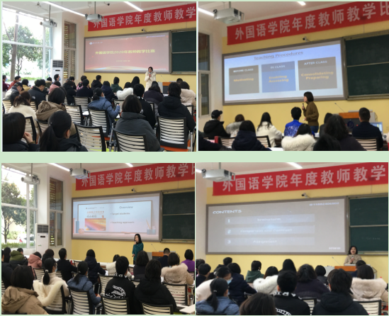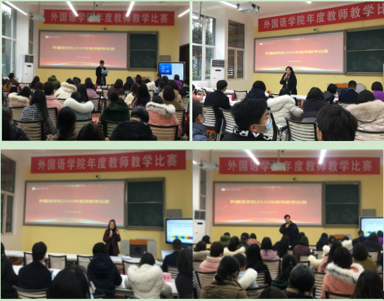 为引导全院教师不断钻研教育教学理论、锤炼教学基本功、创新教学方法、提升教学技能、提高教学水平,外国语学院坚持每年举办一次教师教学比赛,以赛促练、以赛促提高、以赛促交流。根据《外国语学院教师教学比赛实施办法(2020年修订版)》,学院教学比赛于十月启动,十一月各教研室组织初赛并按教师人数的10%推荐初赛优胜教师参加学院决赛,十二月学院教学办组织开展决赛,决赛分为教学设计方案评比(占总分的60%)和现场教学展示(占总分的40%)两个环节,学院教学指导委员会成员担任决赛评委。